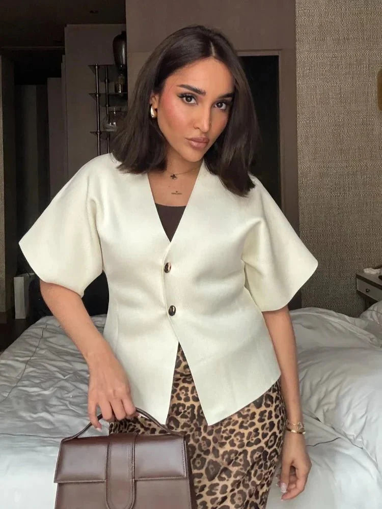 • V-Ausschnitt und Zweiknopf-Detail für einen modernen Look.