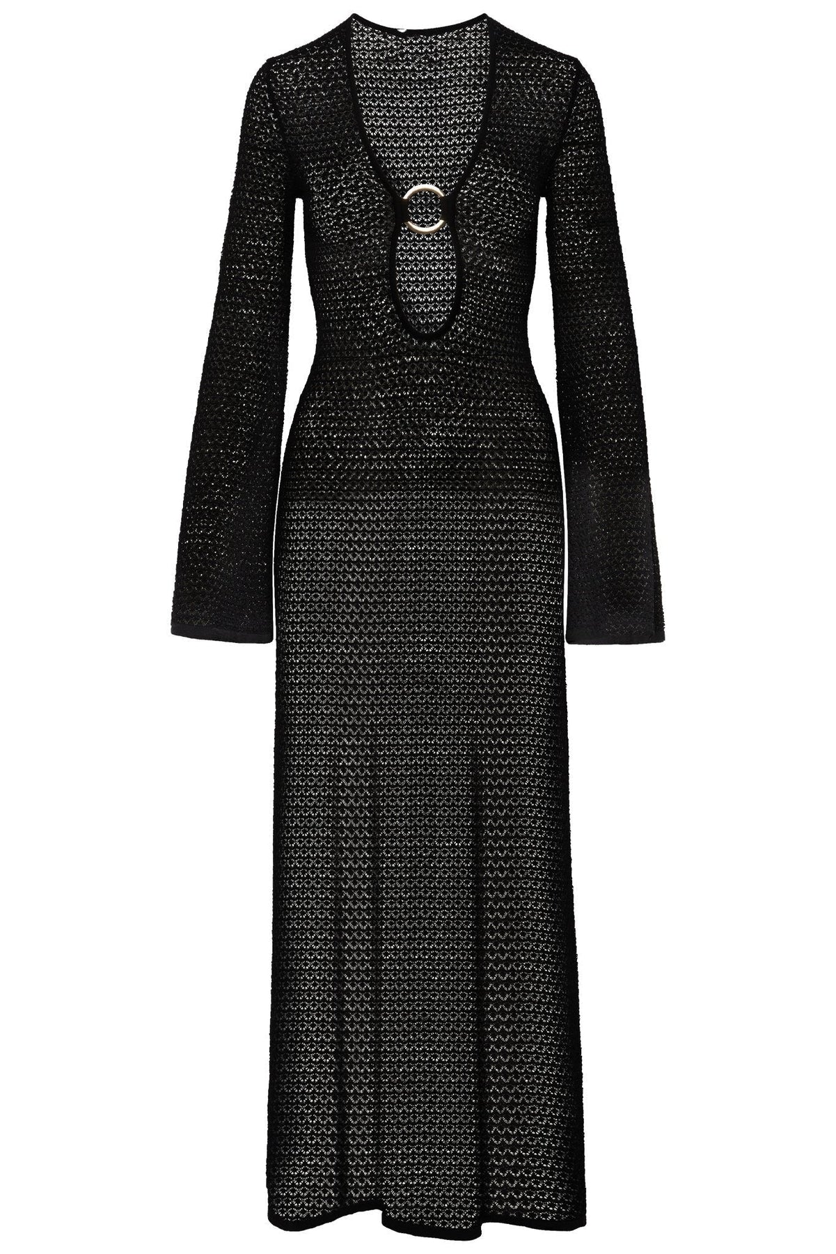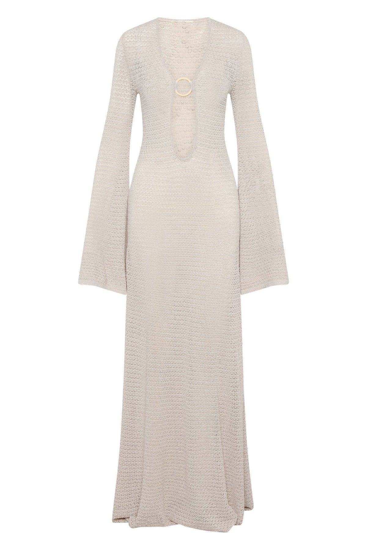 • V-neck, Metal Ring Trimming, Cut-out, Crochet Knitting, See-through, Bell Sleeves, Floor Length.