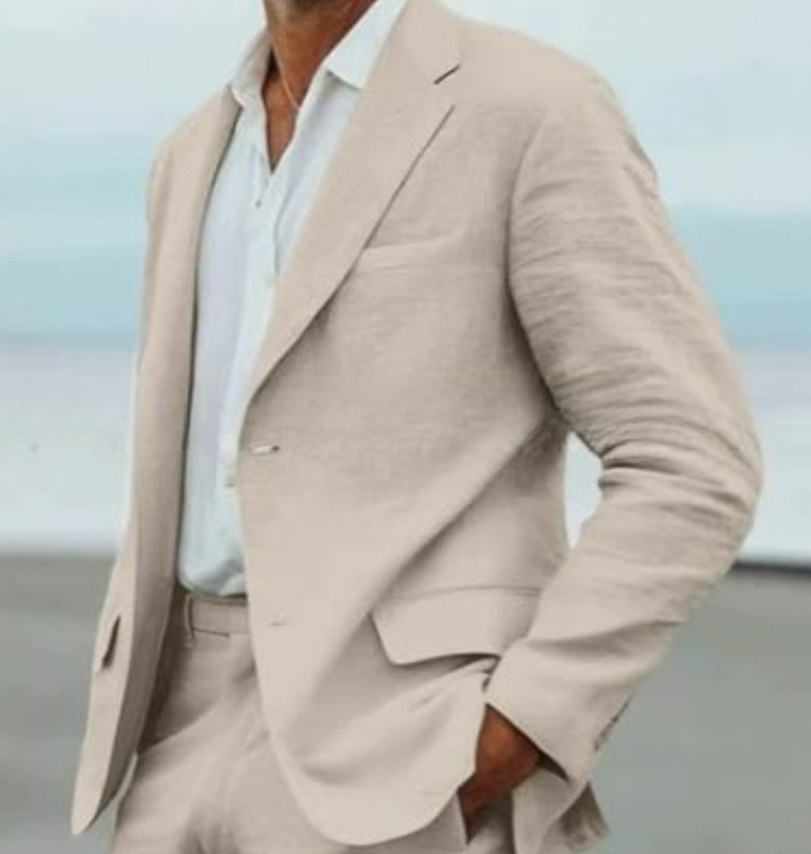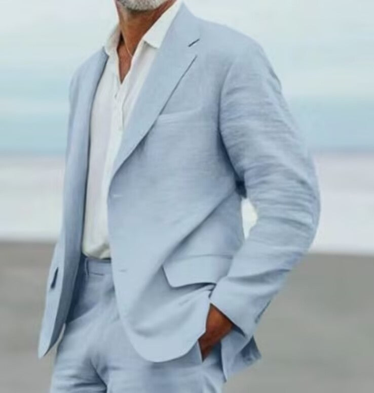 Dieser stilvolle Zweiteiler ist der perfekte Begleiter für jede Sommerhochzeit am Meer. Mit seinem luftigen Tragekomfort und dem eleganten Schnitt vereint er Leichtigkeit mit gehobener Eleganz. Ideal für Herren, die am Strand stilvoll und entspannt auftreten möchten.
