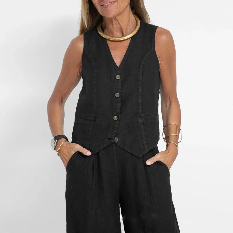 Dieses stilvolle Set besteht aus einer taillierten Weste mit Knopfleiste und einer weit geschnittenen Hose mit fließendem Fall. Die Kombination wirkt gleichzeitig entspannt und strukturiert – perfekt für City-Looks, kreative Business-Outfits oder sommerliche Anlässe mit Stil.